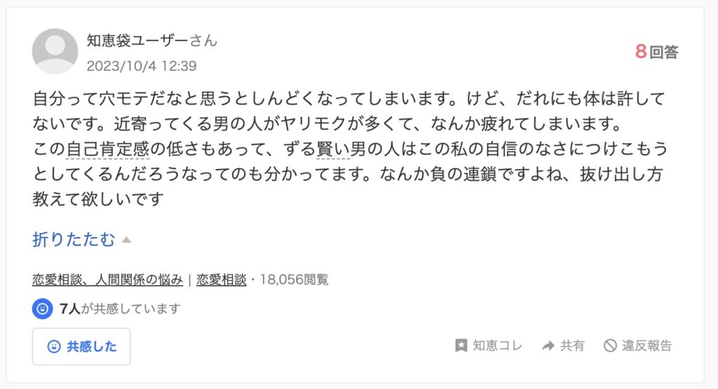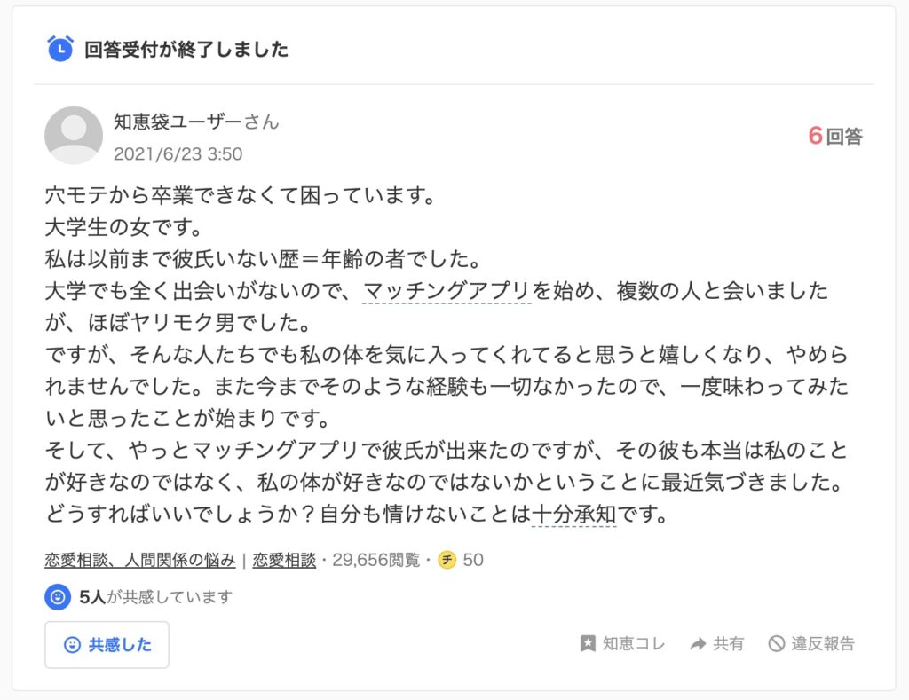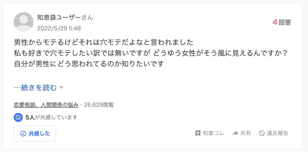 穴モテに関する知恵袋の悩みをピックアップして紹介