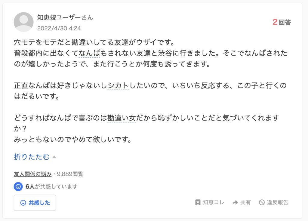 穴モテをモテだと勘違いしてる友達がウザイです。
